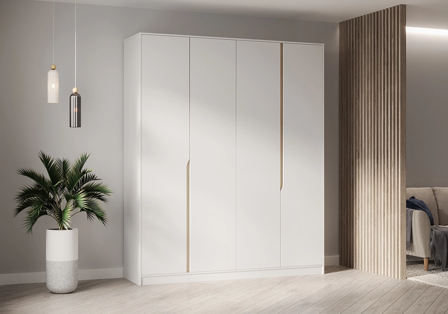 Геометрия фасадов распашных шкафов 2026 выходит за рамки привычных прямых линий. Хотя классические прямоугольные двери остаются самыми востребованными, дизайнеры активно экспериментируют с формами, рельефами и пропорциями. Одним из заметных трендов становятся фасады с вертикальной или диагональной фрезеровкой. Такой декор создаёт динамику и подчёркивает современный характер мебели.
