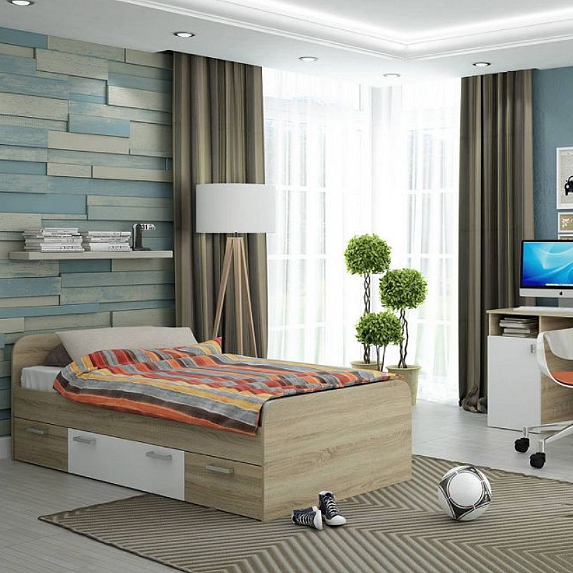 Кровать Мика без обивки дуб сонома/белый без подъёмного механизма 900x1900, щит-основание, изголовье жесткое